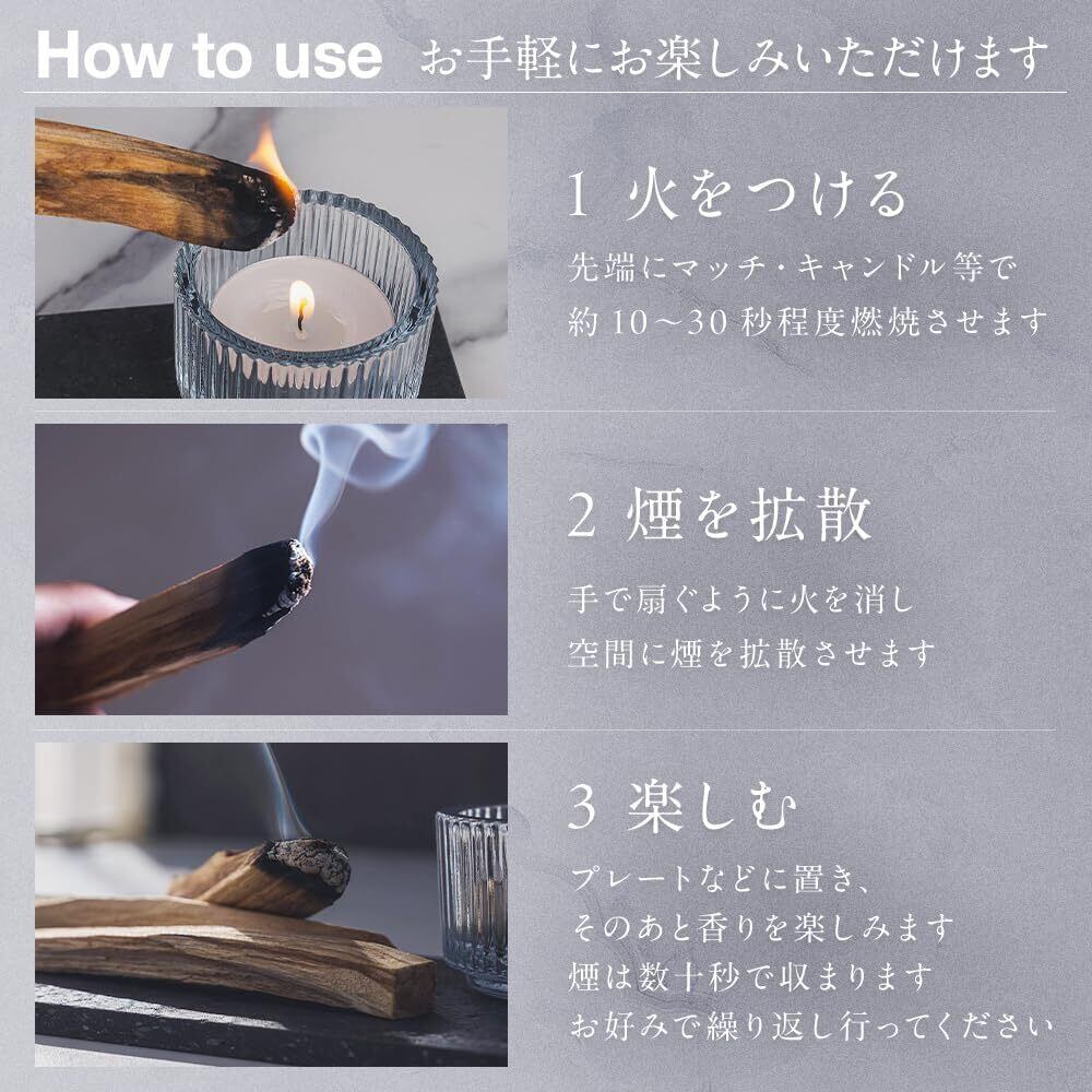 ※パロサントは天然の香木のため、環境によっては湿気を含み感えにくくなる場合があります。その場合は日光が当たる場所で数時間放置すると水分が抜け、燃焼しやすくなります。